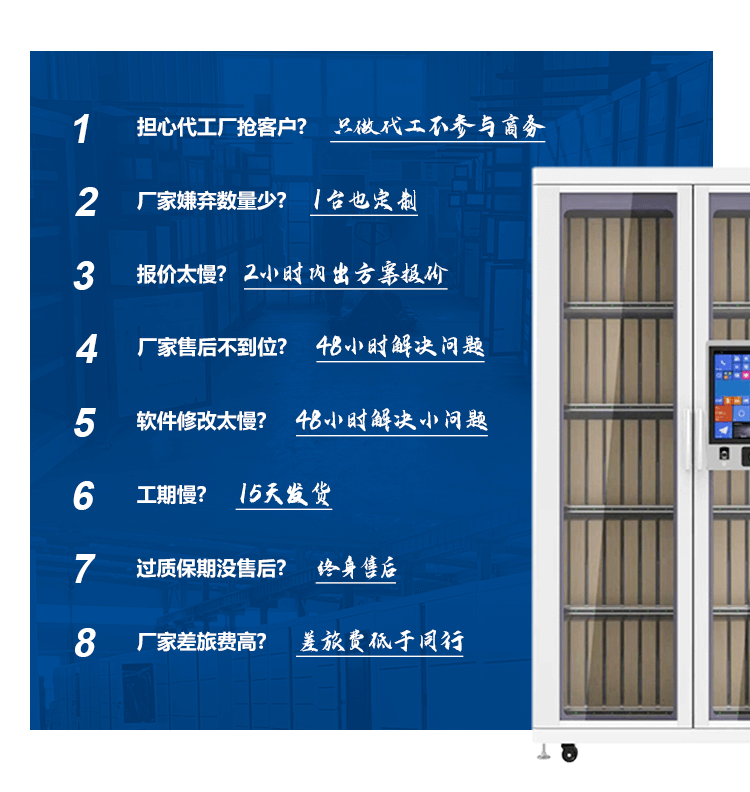 有15年管家式服務(wù)中間商的成熟經(jīng)驗(yàn)。成熟產(chǎn)品有RFID智能柜、稱(chēng)重柜、光敏柜、智能工具車(chē)、公檢法檔案管理柜。支撐軟件定制開(kāi)發(fā)。